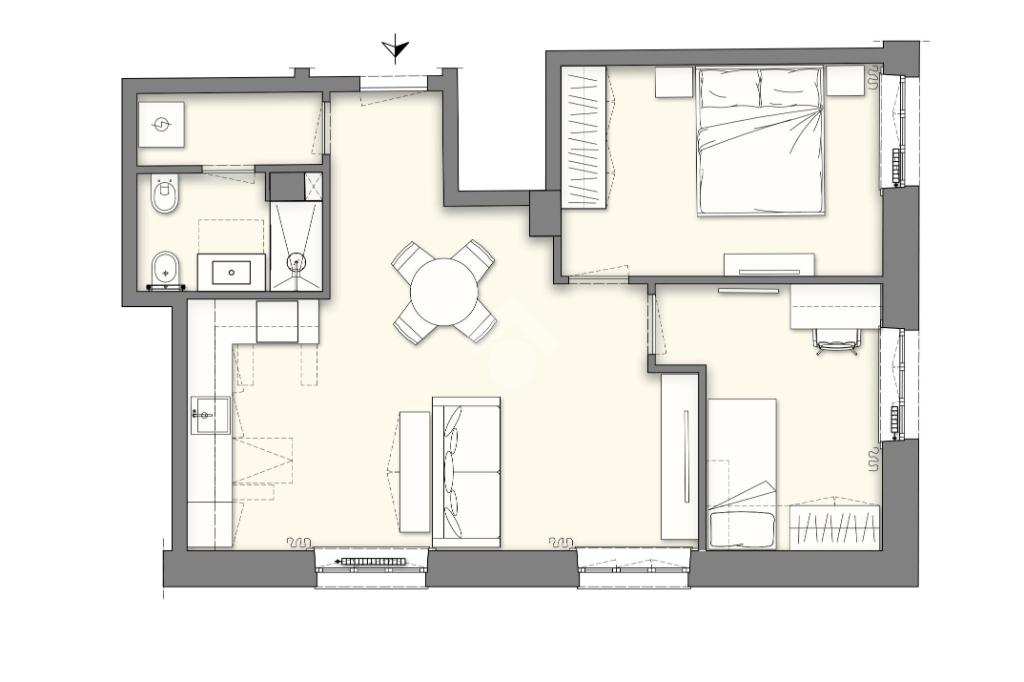Il Trilocale, ottimizzato in ogni suo spazio, è composto da un comodo soggiorno con angolo cottura, due camere da letto perfette per ogni esigenza abitativa, una pratica zona
